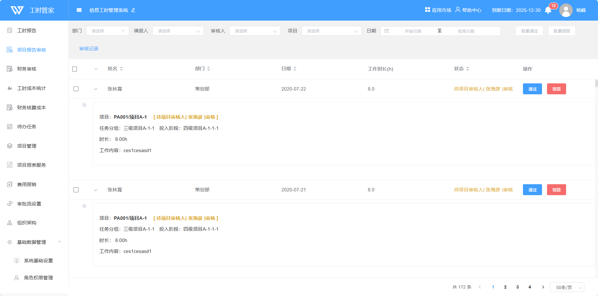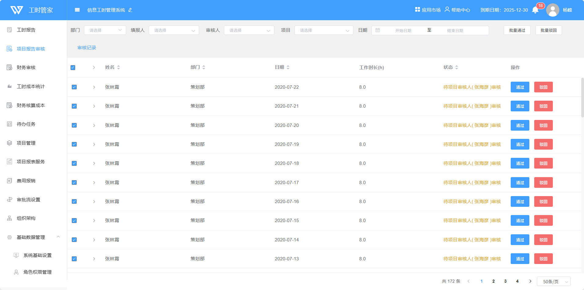 l 审核操作高效便捷:提供批量通过、批量驳回功能,针对单条工时记录(如张林霄2020年7月13日-22日期间的每日8小时工时)可单独操作,系统实时记录审核状态(待审核、已通过、已驳回),形成完整审核轨迹。