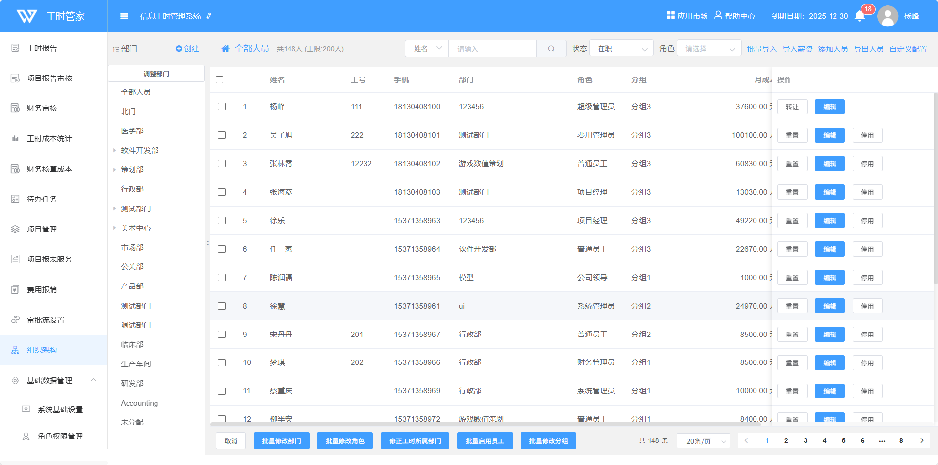 l 清晰的组织架构管理的,可按部门(如策划部、研发部、行政部等)划分人员归属,便于审计过程中按部门核查工时数据,符合企业组织架构与工时核算的对应关系要求。