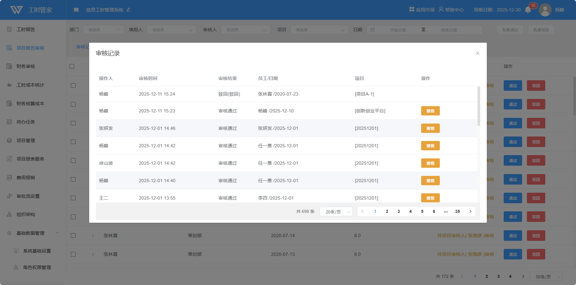 l 系统完整记录工时相关全量数据,包括填报人、填报日期、工作时长、审核人、审核结果、项目关联信息等,所有操作轨迹可追溯,满足审计对数据真实性、完整性的核查需求。