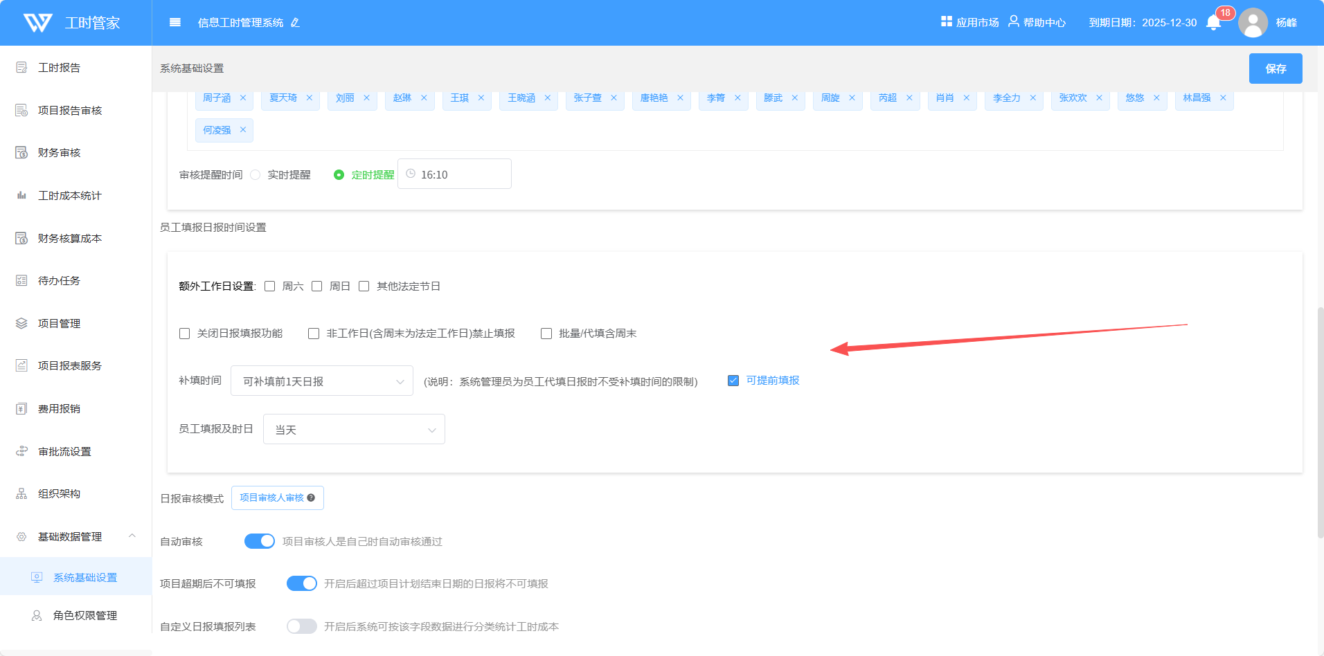 l 设定明确的填报规则:员工需按日填报工时(默认当天填报),系统支持补填前1天日报(管理员代填不受限制),同时可设置额外工作日(如周六、周日及法定节日)填报权限,兼顾研发工作灵活性与规范性。