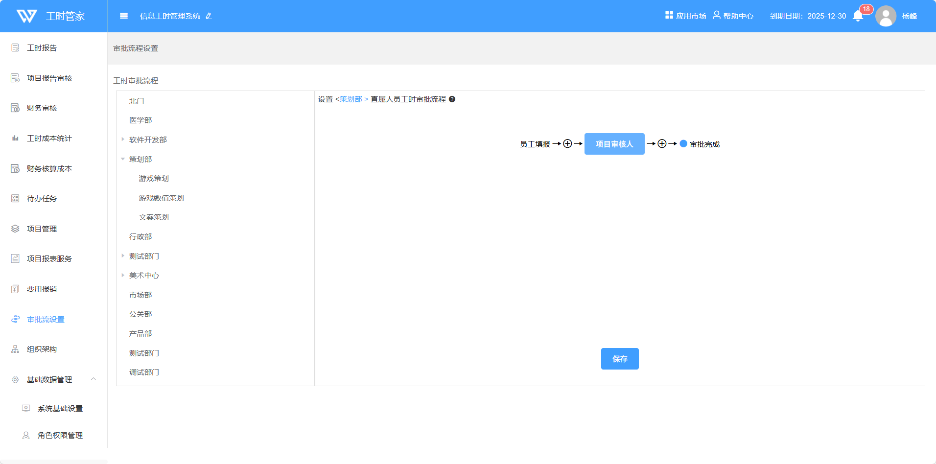 l 灵活配置审批流程:支持按部门(如软件开发部、策划部、测试部门等)设置专属审批流,明确“员工填报→项目审核人→审批完成”的审核链路,示例中策划部员工工时统一由张海彦作为项目审核人审核,确保审核责任到人。