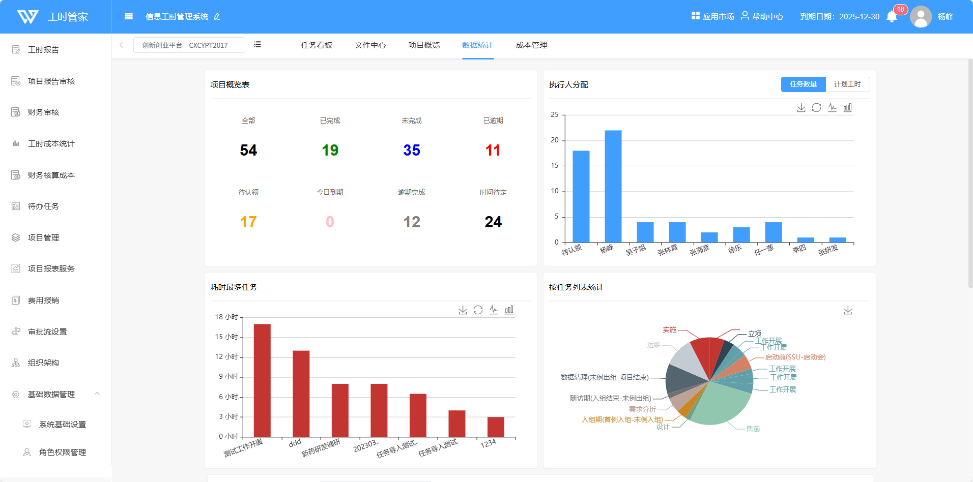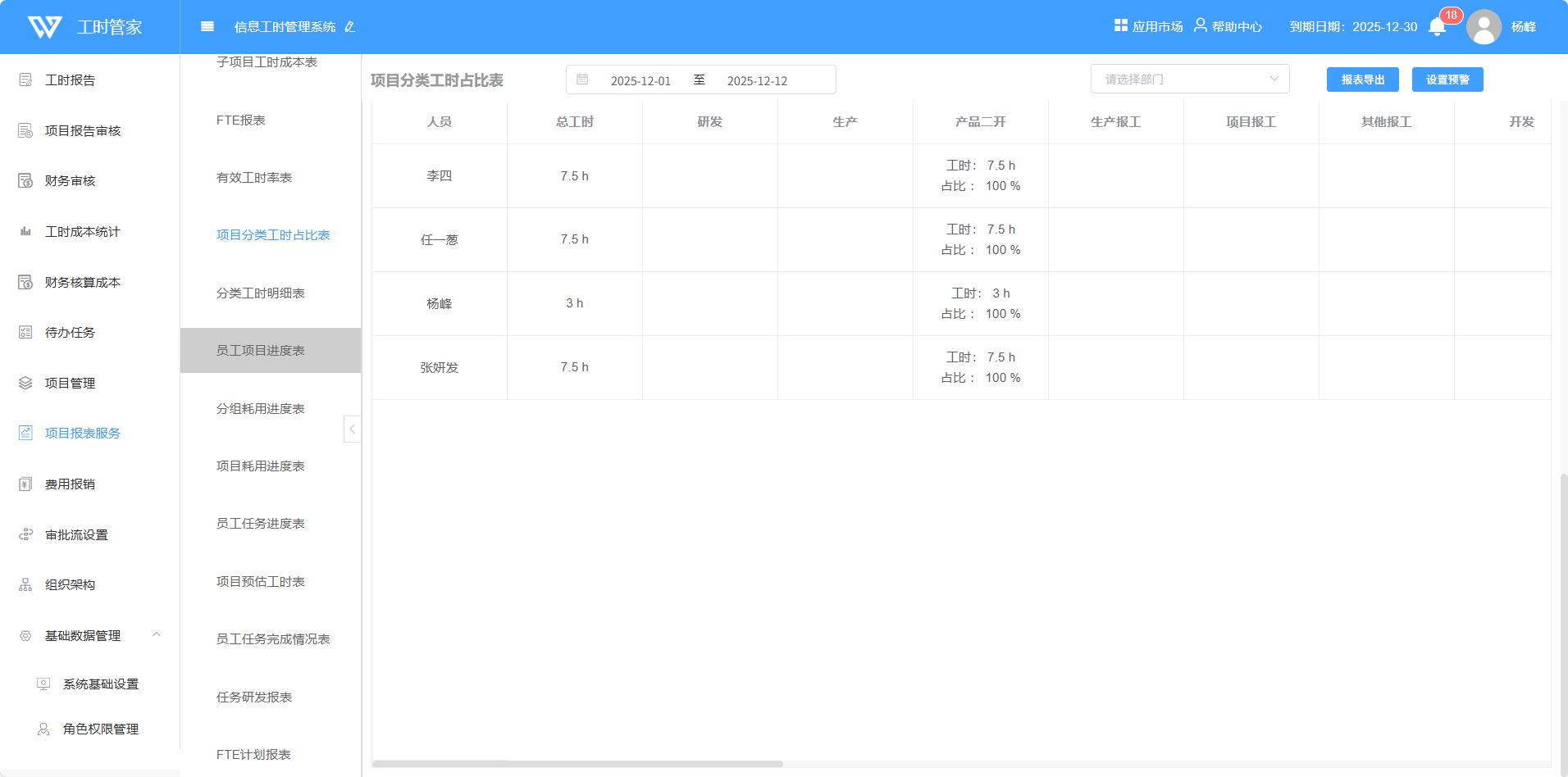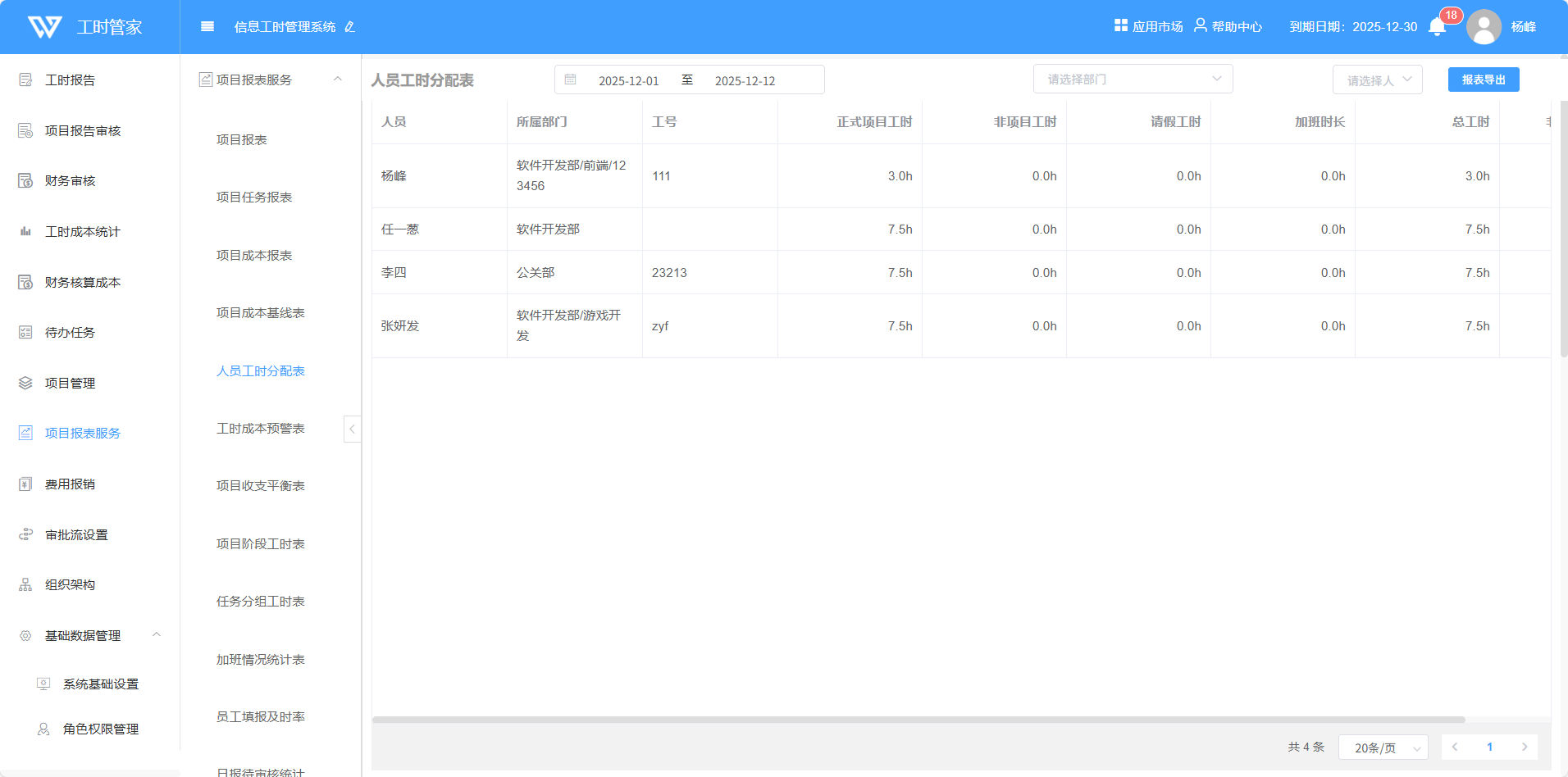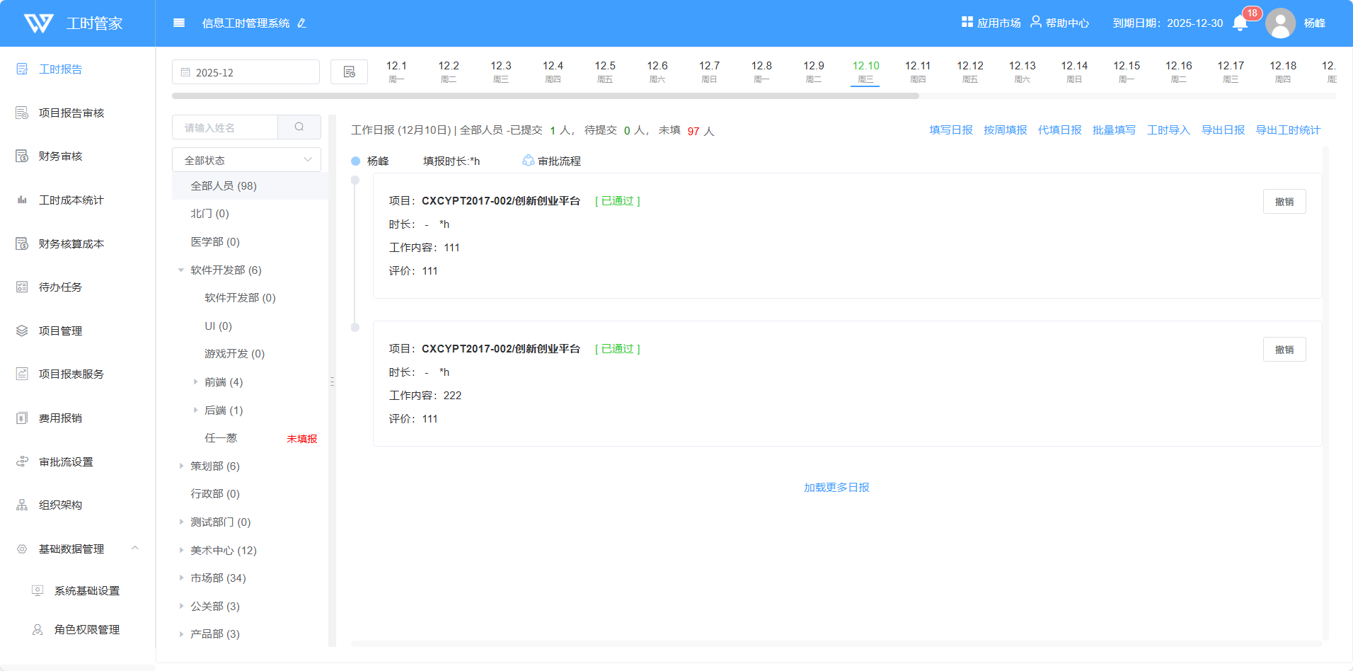 l 区分全职/兼职人员管理:支持多人协作任务的工时填报(如项目测试任务由杨峰、张林霄共同执行),可精准统计不同岗位、不同用工形式人员的工时投入,满足审计对人员工时分类核算的要求。