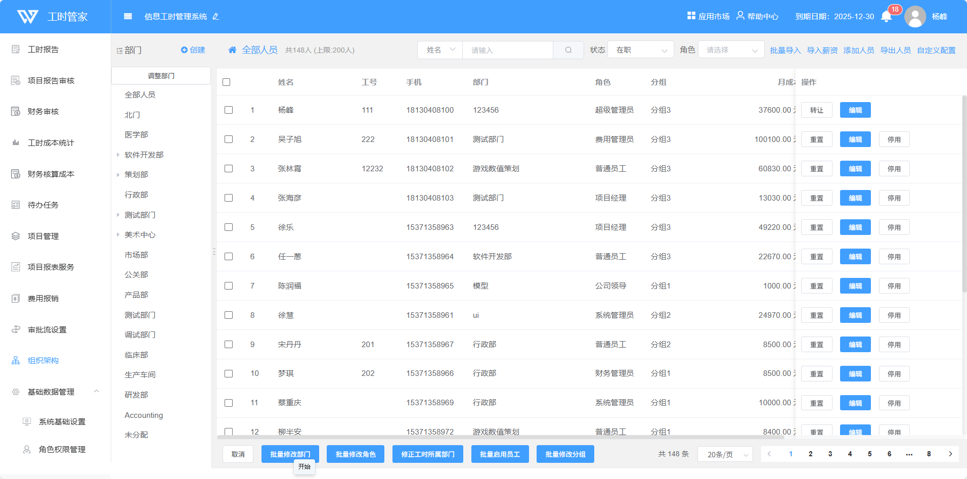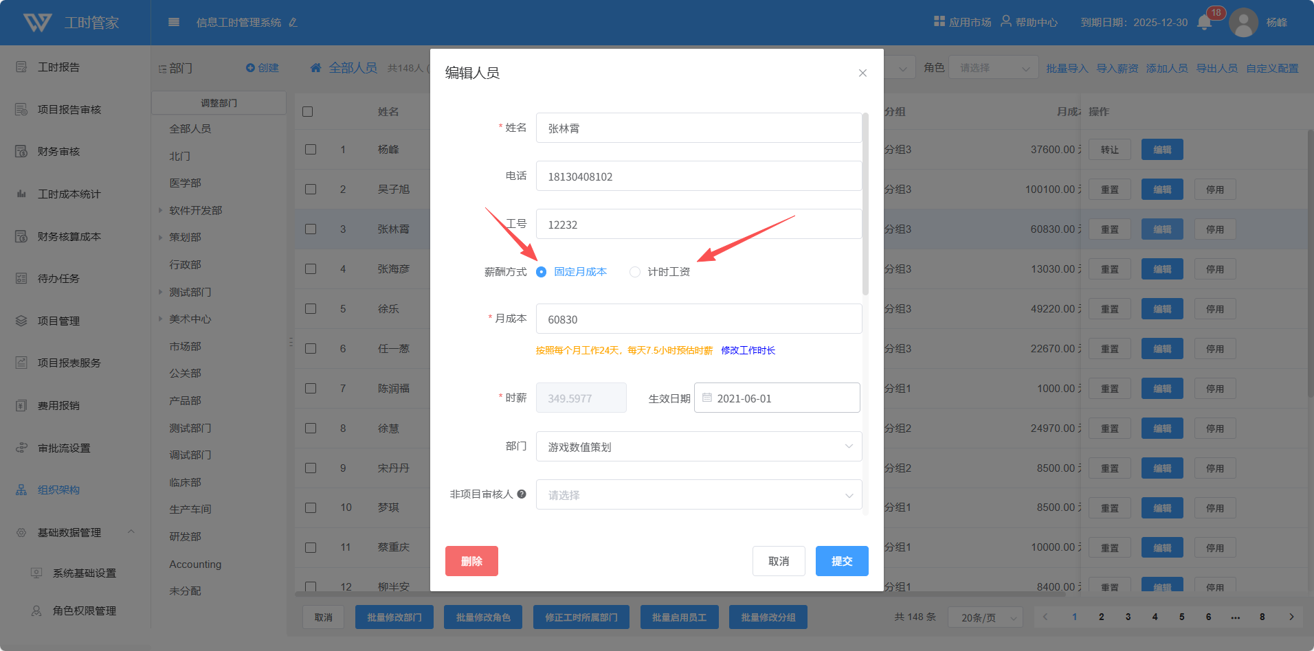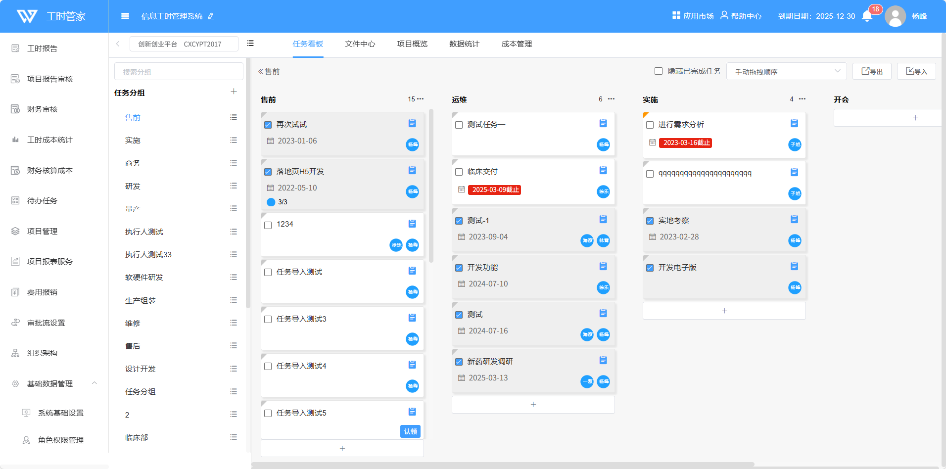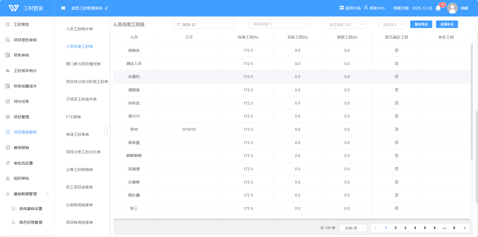 l 区分全职/兼职人员管理:支持多人协作任务的工时填报(如项目测试任务由杨峰、张林霄共同执行),可精准统计不同岗位、不同用工形式人员的工时投入,满足审计对人员工时分类核算的要求。