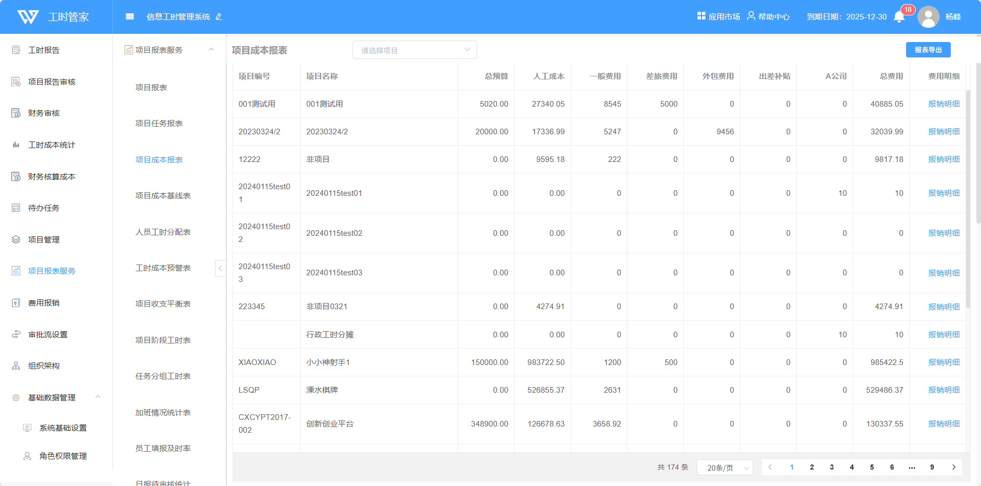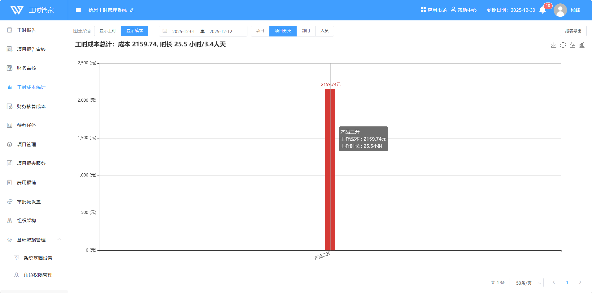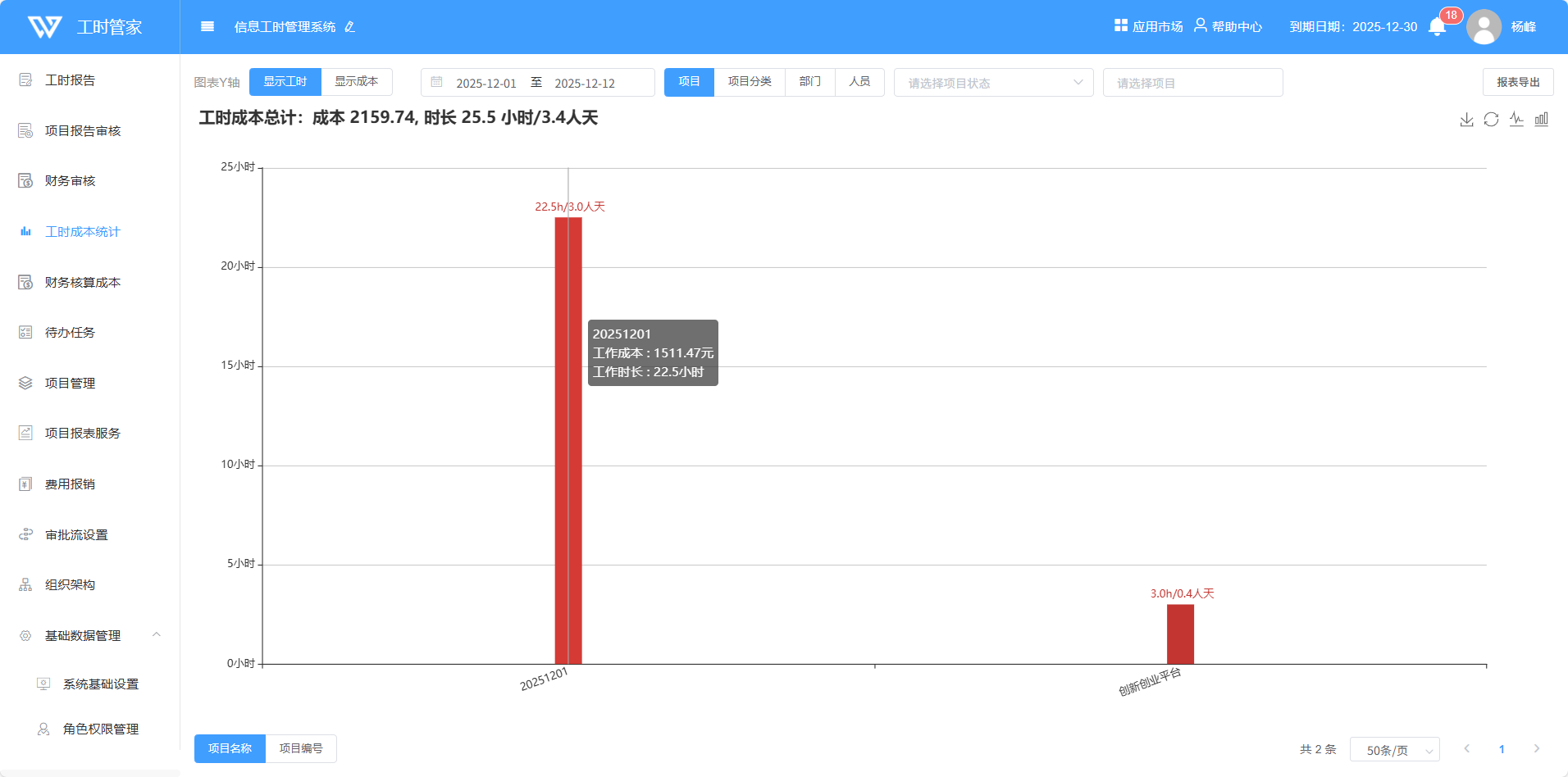 l 实时统计项目工时数据,生成项目工时报告,清晰呈现项目总时长、成本(如示例中2025年12月1日-12日期间,工时成本总计2159.74元,时长25.5小时/3.4人天),便于监控项目工时投入与预算匹配度。