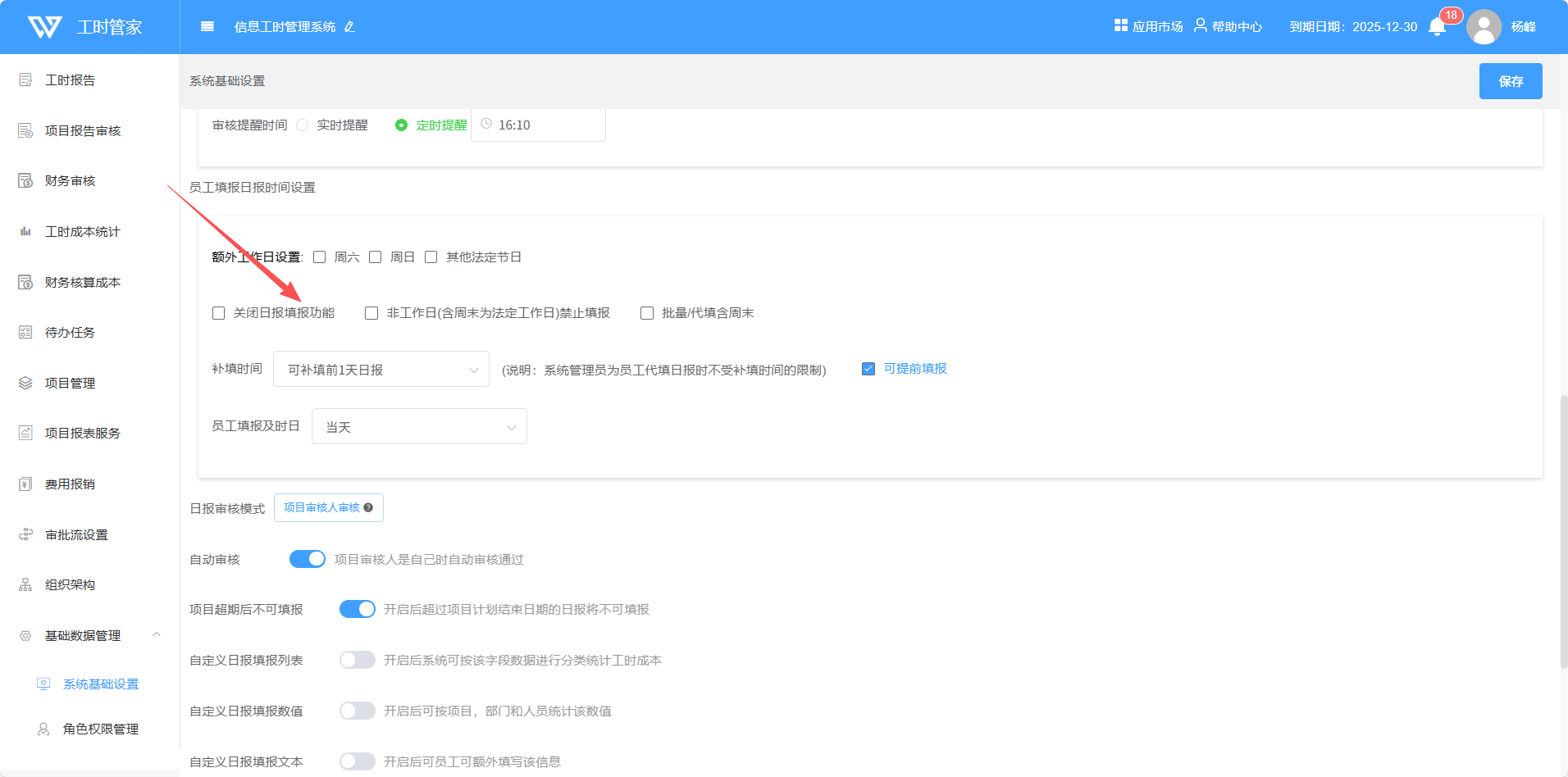 l 支持关闭日报填报功能、设置非工作日填报限制等特殊规则,适配研发企业不同项目阶段的工时管理需求,确保工时管理既规范又贴合业务实际,符合上市审计对工时管理制度合理性的要求。