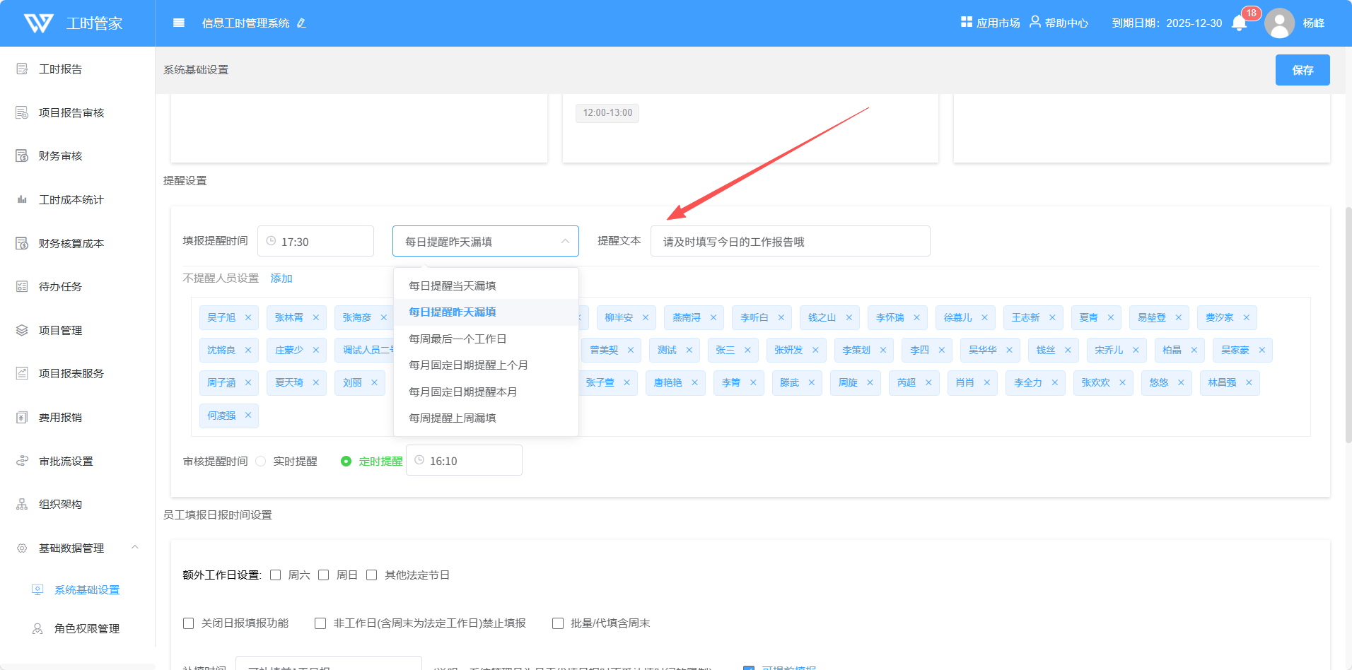 l 漏填提醒机制:设置每日填报提醒时间,自动提醒员工补填漏填工时,提醒文本自定义(如“请及时填写今日的工作报告哦”),有效提升工时填报完整性,避免因漏填导致审计数据缺失。